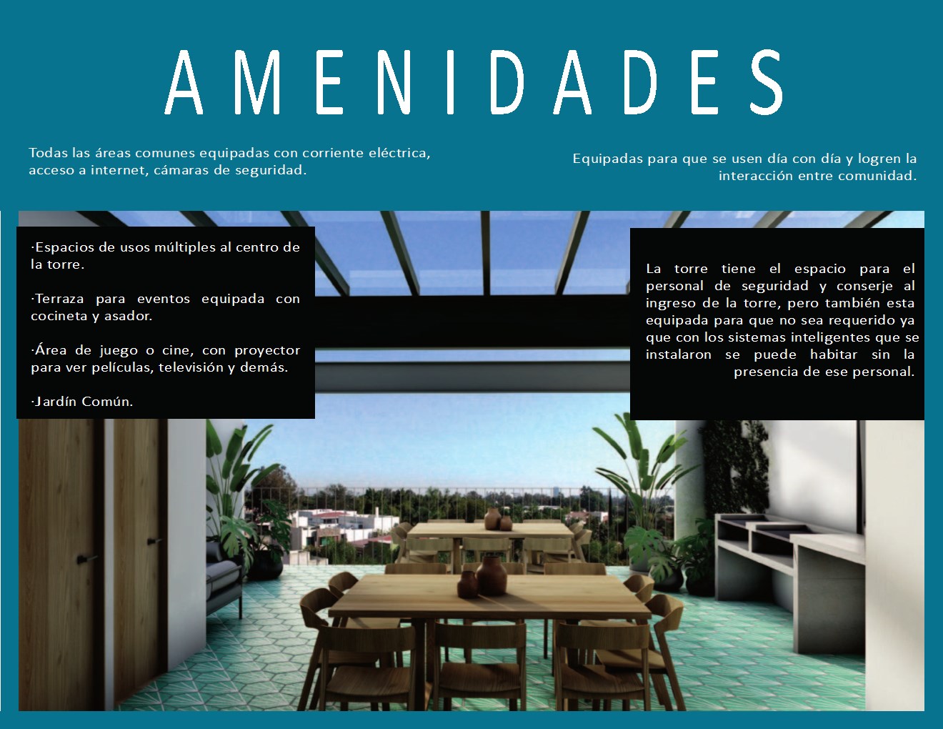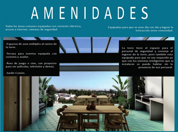 Torre con diseño sustentable al reutilizar el agua pluvial y la instalación de paneles solares en el techo de la terraza para consumo energético de las áreas comunes.